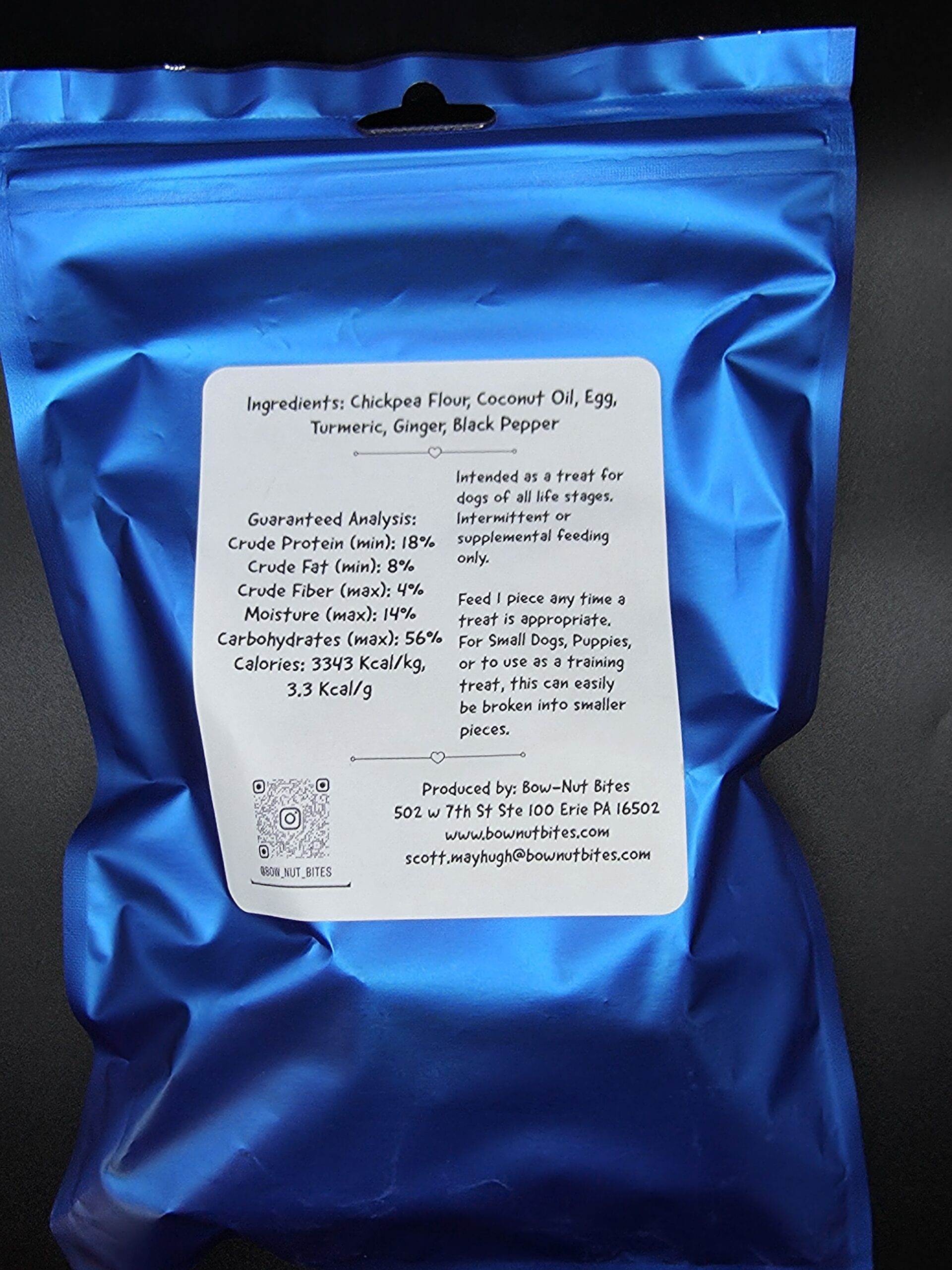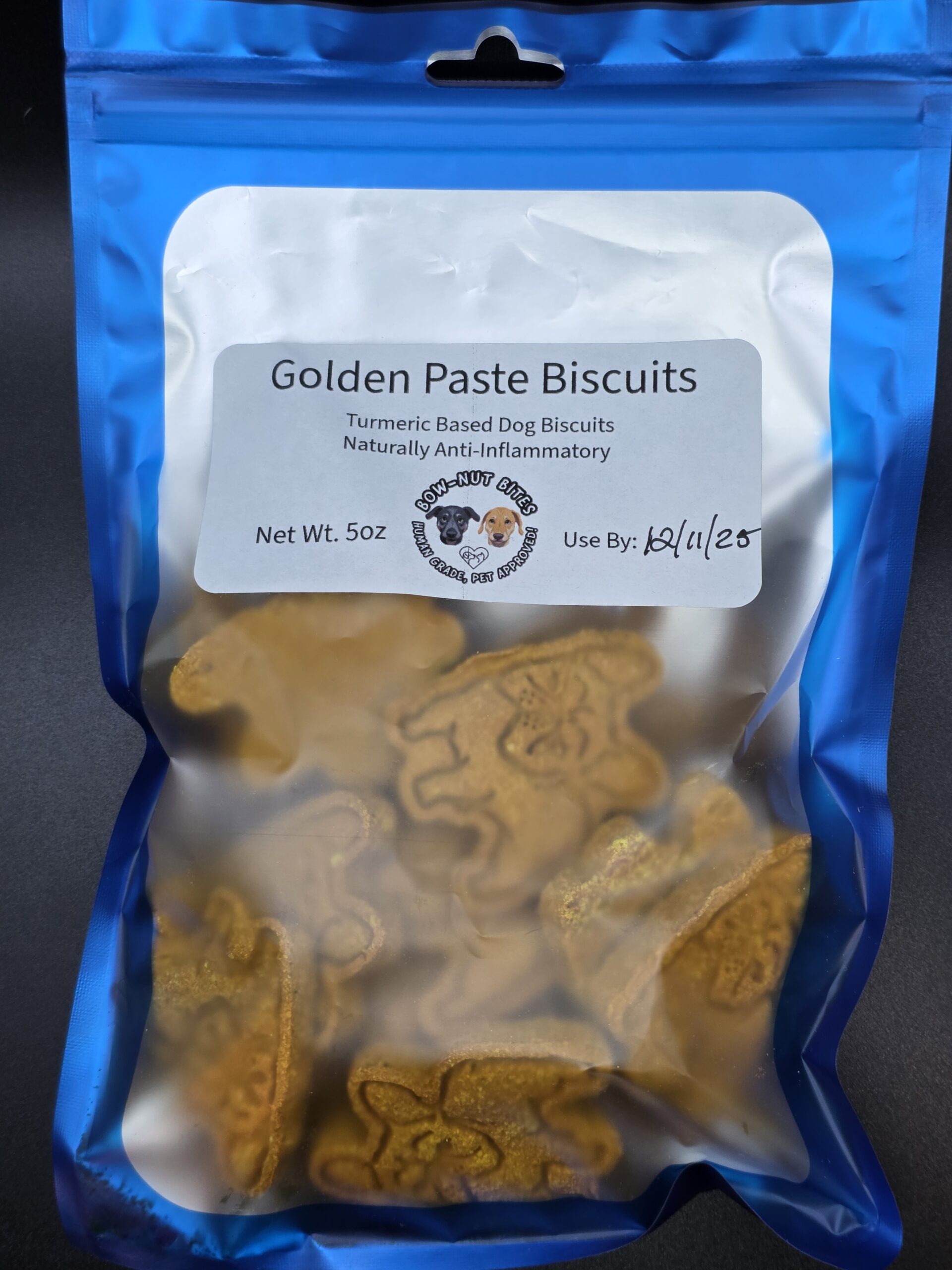 - The golden paste (made with tumeric, black pepper, ginger, and coconut oil) is mixed with chickpea flour -- made with ground chickpeas to create a higher protein biscuit.