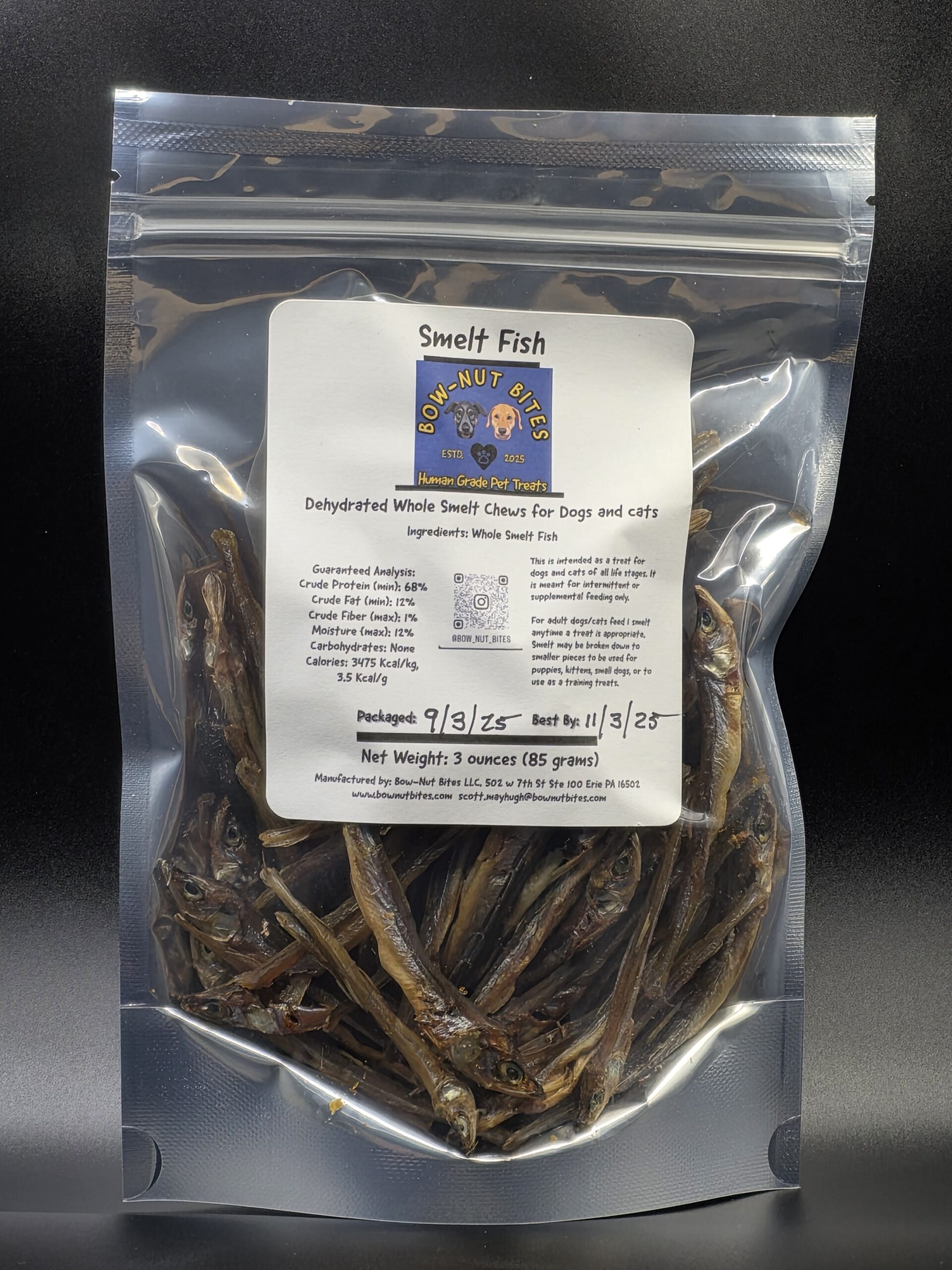 Whole smelt are bathed in a mild vinegar solution and rinsed to minimize odor, then gently dehydrated at controlled temperatures. This retains omega-rich fats and nutrients while creating a crunchy, savory fish treat.